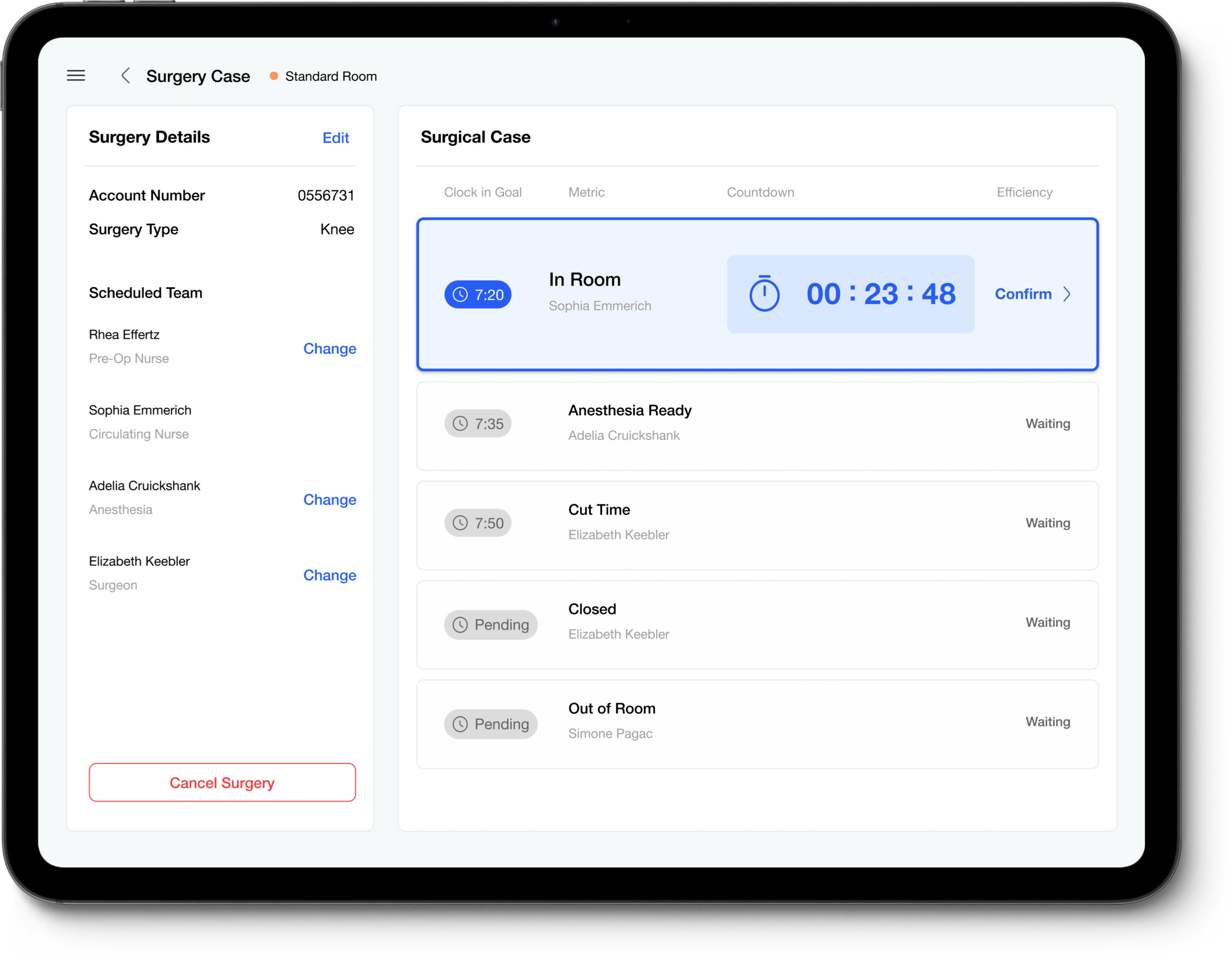 The tablet screen will identify all expectations and record performance through a touch screen. This starts in Pre-op where the Pre-op nurse identifies the patient is ready, and the Anesthesiologist and Surgeon sign-in. Then the intervals of: In Room - Anesthesia Ready - Cut - Closed - Out of Room. Progress is displayed in real time.